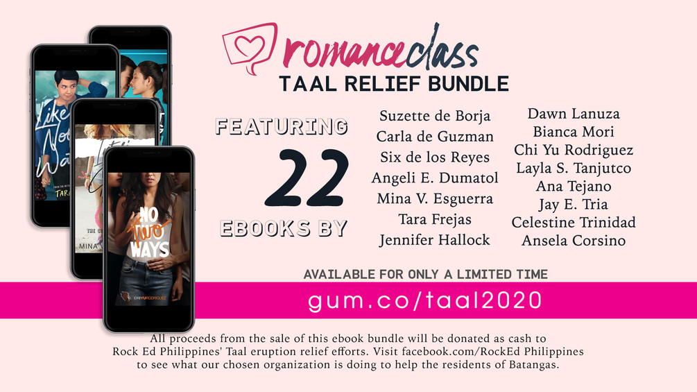Purchase this bundle of contemporary romance e-books in English written by Filipino authors, compiled here to raise funds for relief efforts to help those affected by the Taal Volcano eruption in 2020. All proceeds will be donated to Rock Ed Philippines.